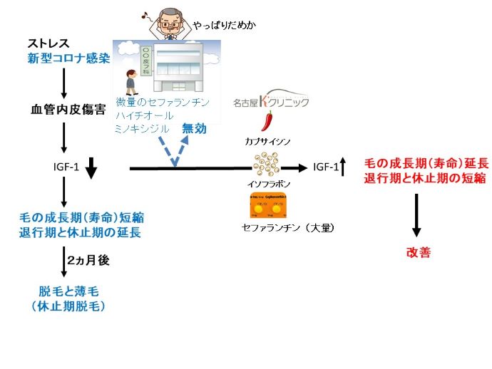 40代の男性患者様は、今年の4月中旬に新型コロナに感染し、15日間の入院を経て退院しました。その後、全身倦怠感が続いていましたが、その2ヵ月後に脱毛が始まり、近所の皮膚科を受診。微量のセファランチン、効かないミノキシジルとハイチオールC(これ、何で出るの?)を処方されましたが、もちろん無効。ご自宅の床に大量の抜け毛を見る毎日となりました。居住地域では、この脱毛症を治せる医療機関を見つけられず、当クリニックに来院されました。額の生え際と前頭部に薄毛がありました。新型コロナ感染や大きなストレスでは、IGF-1を増やすうえで重要な、血管の内側の細胞が傷害され(活性化されたリンパ球などで)、IGF-1が減ります。その結果、毛の成長期間(寿命)が短縮し、退行期や休止期が延長します。毛の寿命が2ヵ月くらいに短縮するので、感染後2ヵ月後に脱毛するのでしょう。そして、退行期や休止期が延長しているので、新しい毛は生えてこずに薄毛になります。この時、多くの毛は、休止期になっているので、これを休止期脱毛と言います。もし、円形脱毛症の素因を有するヒトであれば、ここで、円形脱毛症を発症します。IGF-1が低下した結果、自己免疫が起こってきて、さらにIGF-1が低下して、ひどく急激な脱毛が起こってきます。これらの脱毛を治すには、IGF-1を増やすしかありません(図)。これまでに、多くの新型コロナ感染後の脱毛の患者さんが来院していますが、皆様、治療2~3ヵ月で治っています。円形脱毛症よりも、休止期脱毛は、短期間で治ります。しかし、家中の床が、抜け毛でいっぱいとは、耐え難かったでしょう。髪の毛の減りは、パーマをかけて目立たなくしていたそうです。ここでも、近所の皮膚科さんは無力だったですね。全身倦怠感も改善します。