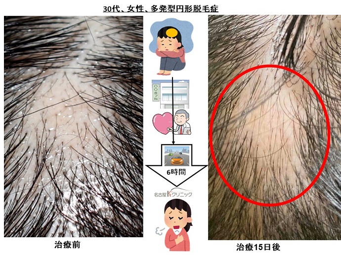 山陰地方在住の30代の女性患者さんは、ヤブ耳鼻科医の細菌性の急性扁桃炎にロキソニンのみ処方され、高熱が下がらないので、2日間で6錠も飲んで、その一週間後に円形脱毛症を発症しました。抜け毛は多く、髪の毛の量も減ってきて、皮膚科を受診するも治らず、抑うつ状態になり、心療内科まで受診しました(図)。ネット検索で当クリニックを見つけられ、自ら自動車を運転され、6時間かけて来院されました。来院時は、後頭部に最も大きな脱毛斑があり(写真)、額の生え際でも脱毛がありました。”治りますよね”と何回も念を押され、不安は隠しきれない、いやむしろ、憔悴した感さへありました。カプサイシンとイソフラボンのサプリメントと大量のセファランチンで、IGF-1を増やす治療を開始すると、その3日後には、額に産毛が生えてきたと写真が送られてきて、”生えてますよね”と念をおされ、治療15日後の2回目の遠隔診療時では、後頭部の脱毛斑内部に、短い産毛が増えていることが確認されました。電話で、”産毛が生えてますよ”とお伝えすると、”この毛は、もう抜けませんよね”とやはり、念を押されましたが、一方で、安心されていました(図)。全国で、いや世界中で同じような思いをされている患者さんは、たくさんいるでしょう。IGF-1を増やす治療は、まだまだ、普及しません。古いアタマで作られた、効果のない皮膚科の標準治療が、とても邪魔です!