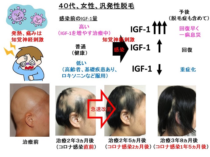 中国地方在住の40代の女性患者さんは、家庭内ストレスで円形脱毛症を発症し、その後の6ヵ月間以上の皮膚科治療で悪化しました。その後、放置していましたが、出産で著明悪化し、全身の毛が抜けました(汎発性脱毛)。遠路、当クリニックに来院され、カプサイシンなどのサプリメントとセファランチン大量(150mg/日)で、IGF-1を増やす治療を開始すると、産毛が生えてきました。そして、以前お伝えしたように、新型コロナウイルスに感染して2か月後に、著明な改善が認められました(写真)。感染症自体も軽く済みました。感染で起こってくる発熱や体の痛みは、感染で全身の知覚神経が刺激されやすくなっている証拠で、この時に、IGF-1は増えています。当クリニックの知覚神経を刺激する治療を受けておられたので、感染による知覚神経刺激がより著明となり、脱毛が改善され、感染も軽く済んだと考えられます。その後も、治療を続けられ、脱毛斑もあとわずかとなり、髪の毛の質も良くなっています(写真、治療3年8ヵ月後)。しかし、治療開始から2年3ヵ月後と感染から2ヵ月後の頭部を比べて見ると、感染後の改善が高くなっています。このように、IGF-1が高いヒト(つまり、治癒力が高いヒト)が感染すると、感染も軽く済み、脱毛症もおこしません。しかし、脱毛症がないヒトで、高齢者であったり、基礎疾患があったり、また、飲んではいけないロキソニンを飲むとIGF-1が下がってしまい、感染も重症化しますし、脱毛症も起こってきます。ヒトの治癒力、すなわち、IGF-1の体内の量、これが高いヒトは、感染や他の病気でも、その後に、体はバージョンアップして、いわゆる一病息災となります。高齢でのIGF-1低下はどうしようもないですが、カプサイシンやイソフラボンなどのサプリメントで増やすことができますので、治癒力を上げられますが、ロキソニンや抗ヒスタミン剤でIGFを下げると(つまり、治癒力を下げると)、感染も重篤になり、感染で脱毛も起こってくるでしょう。日ごろからカプサイシンとイソフラボンなどのサプリメントを飲むことと脱毛薬を飲まないことは、治癒力を保つ上で極めて重要です。