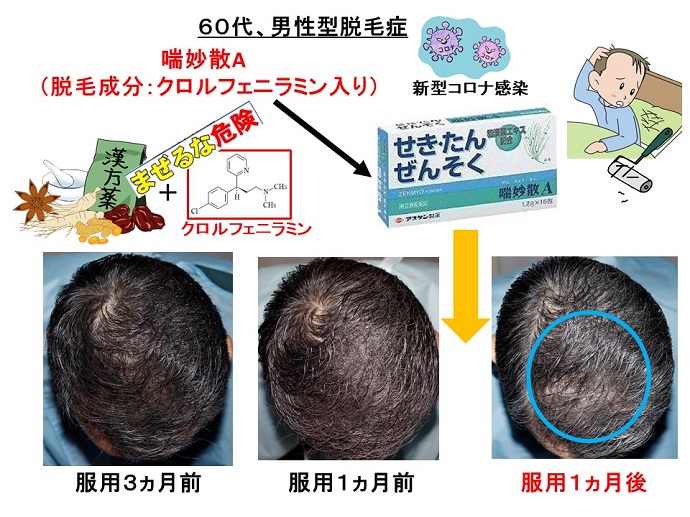 60代の男性型脱毛症の患者さんは、IGF-1を増やす治療により改善が続いていました。男性型脱毛症では、円形脱毛症と違って、脱毛薬を飲まない限り、再発などはなく、順調に、治療をやればやるほど改善します。したがって、患者さん自身に脱毛する薬を飲んだ自覚がなくても、定期的な診察で明らかな脱毛があると、脱毛薬の服用を疑えます。この患者さんも、最近の受診時に、地肌が透けて見えるようになったので(写真、服用後1ヵ月)、何か薬を飲まなかったかどうかをお尋ねすると、新型コロナに感染して、カロナールしか飲んでいないとのお返事でした。そんなことはないと、厳しく追及すると、”漢方薬なら脱毛しないということだったので、漢方薬の咳止めである喘妙散Aは飲みました”とのお答えでした。その漢方薬の成分を調べて見ると、漢方成分に加えて、脱毛成分クロルフェニラミンが加えられていました。漢方成分のみでは、効果が出るのに時間がかかるので、鼻水やくしゃみを即座に止める抗ヒスタミン剤(脱毛成分)が混入されていました。カタカナの名前ではなく、漢字の名前で、副作用のない漢方薬を偽装し、実は西洋医薬品を混入させる脱毛薬の”薬の印象操作”をしています。この患者さんも、騙されて飲んでしまいました。起床時、枕には多数の抜け毛があり、コロコロで処理していたそうです。新たな薬を服用、または使用するときは、配合された成分を必ずお渡しした脱毛成分表で、それが入っていないことを確かめて下さい。男性型脱毛症だったので、治療を続ければ回復しますが、円形脱毛症なら、脱毛がしばらく止まらない、ひどい再発につながります。見るからに気落ちされていました。
