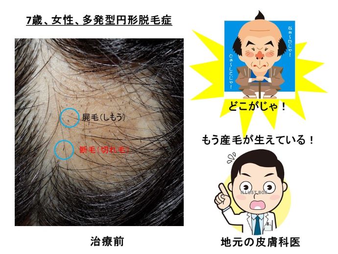 北海道在住の7歳の女性患者さんは、伯母様に重症の円形脱毛症の既往があり、ご自身は、生活環境の変化で、円形脱毛症を再発しました。近所の皮膚科に行くと、不幸中の幸いで脱毛する抗ヒスタミン剤は出されませんでしたが、効果のある治療はなく、円形脱毛症は、悪化して、数が増えていきました。これでは、お子さんがかわいそうと遠路来院されました。大きな脱毛斑がたくさんあり、全体に毛量も減っていました。そして、脱毛部分の内部には、毛の残骸である断毛や屍毛が多数ありました(写真)。産毛など見当たりません。患者さんのお母様が、これらの毛の残骸は産毛ではないのですかと聞かれたので、円形脱毛症が悪化するときに見られるものですとお答えしました。お母様は、驚いたように、受診した近所の皮膚科では、これらは治療で生えてきた産毛と言われました。”どこがじゃ!”
