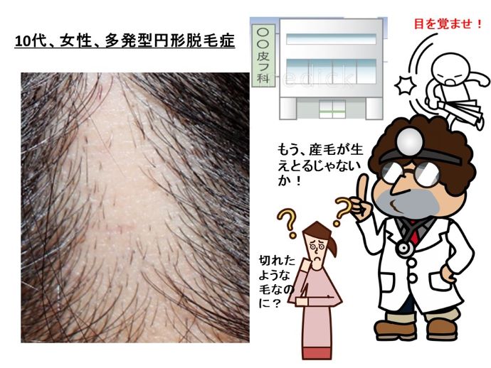 関西地方在住の10代の女性患者さんは、昔からあったアトピー性皮膚炎に対してアレジオンなどの脱毛する抗ヒスタミン剤を使用されていました。そして、当クリニックに来院される2年5ヵ月前に、学校でのストレスと重なって単発性の円形脱毛症を初発しました。皮膚科に治療に行くと、ステロイドの塗り薬と共に、またまた、デザレックスという脱毛する抗ヒスタミン剤を投与され、脱毛斑の数が、どんどん増えて行きました。なのに、皮膚科医は”産毛が増えとるよ”と言ったそうです。患者さんのお母様は、途中から折れたような毛なのに、産毛だなんて、と不思議に思ったそうです(写真、図)。脱毛斑が増えているのに、産毛が生えてくるわけがありません。そうです、この皮膚科のお医者は、産毛と切れ毛の区別がつかないのか、虚勢からウソをついたのかどちらかです。患者さんのお母様は、当クリニックのHPでデザレックスなどで、毛が抜けることを知って、皮膚科で処方される薬の服用を一切やめました。そうしたら、産毛が生えてきたそうです。やる気がないのか、見る目がないのか、どちらでしょうか、皮膚科のセンセー(まさか、両方?)。早速、IGF-1を増やす治療を開始しました。