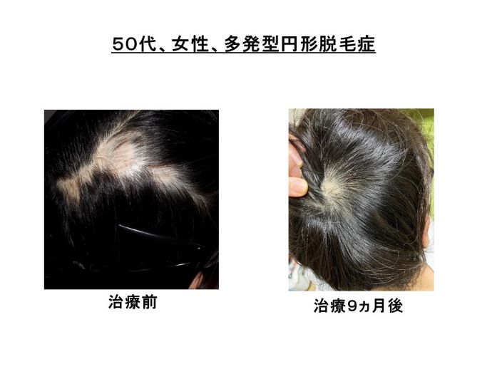 東京都在住の50代の女性患者さんは、当クリニックに来院する7年前に円形脱毛症を発症しました。その後、かゆみ止めで、脱毛作用のあるエバスチンなどの抗ヒスタミン剤を皮膚科で大量に処方され、円形脱毛症が悪化していきました。脱毛斑がいくつもできて、困り果てて当クリニックに来院されました(写真、治療前)。カプサイシンなどのサプリメントと大量のセファランチンで、IGF-1を増やす治療を開始すると、徐々に改善していき、治療9ヵ月後には、多かった抜け毛も減り、脱毛斑の数も減ってきました(写真、治療9ヵ月後)。この時、行きつけの美容室の美容師さんから、髪の毛がしっかりしてきたと言われたそうです。円形脱毛症では、最も強く毛根が傷害された部分では、脱毛しますが、脱毛していない毛の毛根も傷害されており、毛が伸びなくなり、また、毛の質もわるくなり、細くなったり腰がなくなったりします。IGF-1を増やす治療では、産毛が生えるのと同時に、抜けていない毛の毛根の傷害も軽減されるので、抜けていない毛の毛質も良くなります。逆に考えれば、円形脱毛症が出来たときには、抜けていない毛も、脱毛予備軍となっていることになり、IGF-1を増やす治療を受けないと、それらの毛が次々に抜けていき、脱毛斑が増えたり、また、最悪の場合は、すべての頭髪がなくなることもあります。自己免疫疾患である円形脱毛症には、皮膚科治療も含めて、現代医学は、無力です。