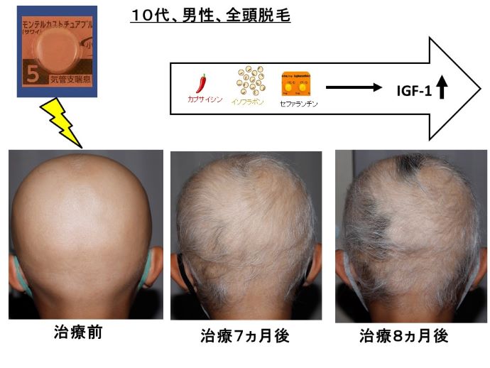 関西地方在住の10代の男性患者さんは、学校のストレスと同時期に、脱毛し、悪夢を見る副作用のあるモンテルカストチュアブルサワイ(図)を服用して、円形脱毛症を発症しました。家族歴はありませんでした。皮膚科に行きましたが、1ヵ月で早々に受診を止めて、鍼治療を受けられました。しかし、効果なく、当クリニックに来院されました。カプサイシンなどのサプリメントとセファランチン大量で、IGF-1を増やす治療を開始すると、治療7ヵ月後には、白い産毛が増えて、徐々に黒い産毛も生えてきて、治療8ヵ月後には、明らかに黒い産毛が増えてきました(写真)。毎月、関西地方から、お母様と一緒に来院され、ご本人も、治すことに気合を入れて取り組んでおられます。家族歴がないことと共に、効果がでるのも当然です。もちろん、お母様も喜んでおられます。しかし、モンテルカストは、脱毛しないし、悪夢も見ないプランルカストに置き換わってほしいものです。このような事実を、一般のお医者さんは知りません。