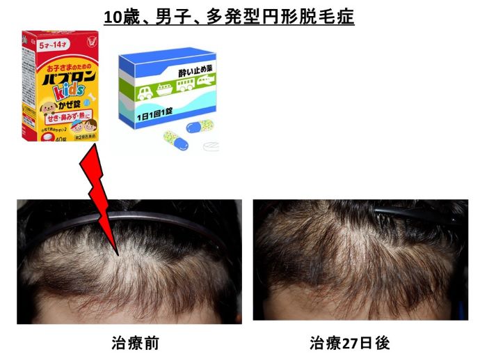 10歳の男子患者さんは、脱毛成分入りの子供用パブロンと車酔いの薬(名前不明)を服用して、円形脱毛症を発症しました。皮膚科治療では、治りません。当クリニックを受診されると、額の上の方に、広く脱毛部分がありました(写真、治療前)。カプサイシンとイソフラボンなどのサプリメントと大量のセファランチンで、IGF-1を増やす治療を開始すると、治療27日後に、産毛が明らかに増えてきました(写真)。外来で、お母様に写真をお見せすると、毛が生えたことに気付かれていなかったようで、治療前との写真との比較で、初めて改善したことがわかり、ほっとしてこのように言われました。重症円形脱毛症は、皮膚科治療で治らないので、皆様、特に小さいお子様のご両親は、大変心配されます。何年も皮膚科に通っても、悪化する一方では、ご家族の深い悩みになります。このような患者さんには、ぜひ、IGF-1を増やす治療をお勧めします。