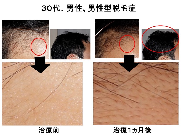 30代の男性型脱毛症(AGA)の患者様は、10年前から薄毛が気になっており、皮膚科に無駄足を運ばずに、当クリニックに来院されました。おでこから薄毛が進行してゆくタイプのAGAでした。育毛のアクセルであるカプサイシン、イソフラボンなどのサプリメントと育毛のブレーキ解除のためのアボルブを、そして、初めから梅花鍼を併用し、IGF-1を増やす治療を開始しました。そして、治療1ヵ月後で、髪の毛全体の黒さが増し、艶やこしが良くなり、ぺちゃんこになった頭頂部に、まるで部分ウイッグを付けたように改善しました(写真)。おでこの上の脱毛部分でも、広い範囲に短い産毛が大量に生えてきました(写真)。あまり、改善の自覚がなかったので、治療前の写真と治療1ヵ月後の写真を比較してお見せすると、驚いたように、このように言われました。そして、寝つきが良くなり、眠りが深くなった分だけ、早く目が覚めるようになって、なぜか、朝ごはんが食べれるようになったとも話されていました。自律神経のリズムも良くなって、色(薄毛)も空(自律神経)も改善して、梅花鍼の最初からの併用は、確かに治療効果の発現をこれまでよりも早くしています。AGAでは、前立腺肥大や前立腺がん、糖尿病、そして心筋梗塞のリスクが高いことが知られています。IGF-1を増やす治療で、これらのリスクまでも低下させることが、当クリニックの治療のメリットです。頭だけをいじったり(マッサージや成長因子を頭皮に注射するメソテラピー)、また、AGA以外の脱毛症にもプロペシアや、怖く、効果のないミノキシジルを使う、その辺のAGAクリニックの治療とは効果面と深さにおいて、一線を画したいものです。