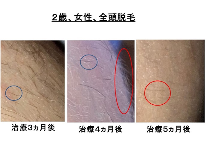 関東地方在住の2歳の女子患者様は、下にお子さんが生まれたのを契機に円形脱毛症を発症しました。家族歴はありませんでした。近所の皮膚科、そして私立大学医学部附属病院の皮膚科を受診しましたが、治療はステロイドの塗り薬だけでした。大学病院でも近所のお医者さんも同じ治療とは驚きですね。皮膚科治療の手詰まりが見えてきます。困り果てて、当クリニックを受診されました。カプセルが飲めないので、タキシフォリン、αGPC、およびセファランチン大量で、IGF-1を増やすを開始すると、それまであった傷んだ黒い毛が大量に抜けて、大量の断毛(切れ毛)が出てきました(治療3ヵ月後、青い円内)。次に、断毛が減って、白い産毛が増えてきました(治療4ヵ月後、赤い円内が白い産毛)。そして、治療5ヵ月後には、黒い産毛が生えてきました(写真、赤い円内)。IGF-1が増えて、傷んだ毛の休止期が短縮するので、毛が抜けて、一方では、毛の幹細胞が活性化され、まず、自己免疫の攻撃を受けない、つまり、攻撃の標的であるメラニン色素がない毛根で、毛が再生されるので、白い産毛が生えてきました。さらにIGF-1が増えると、さらに自己免疫が抑制されるので、メラニン色素のある毛根も攻撃されなくなり、黒い産毛が生えてくるのです。重症の汎発性脱毛の患者さんでも、改善する場合は、同じ経過をたどります。いま、白い産毛しか生えていなくても、IGF-1が増えるにつれて、黒い産毛が生えてきます。そして、黒い産毛が生えてくる頃には、メラニン色素を作る細胞が免疫系で傷害されなくなっているので、それまで白かった毛も、黒くなって、最後は、全部黒い毛になって治癒していきます。大学病院の皮膚科でも、近所のお医者さんと同じステロイド塗り薬のみでの治療、ギブアップの証の様です。